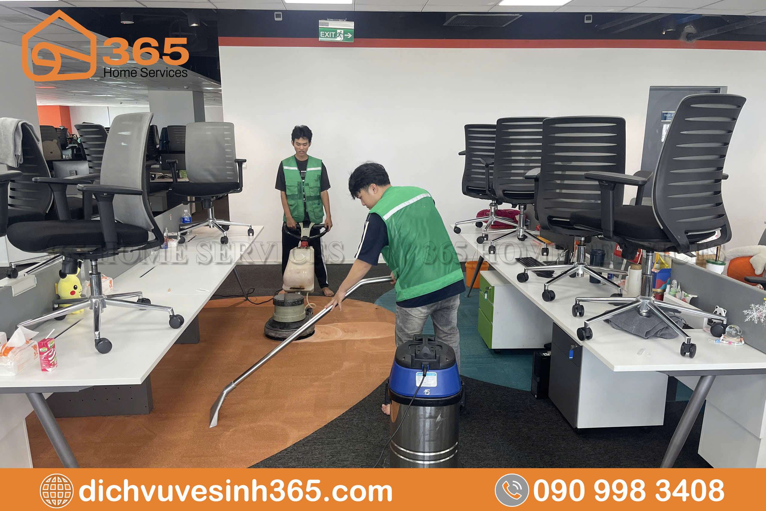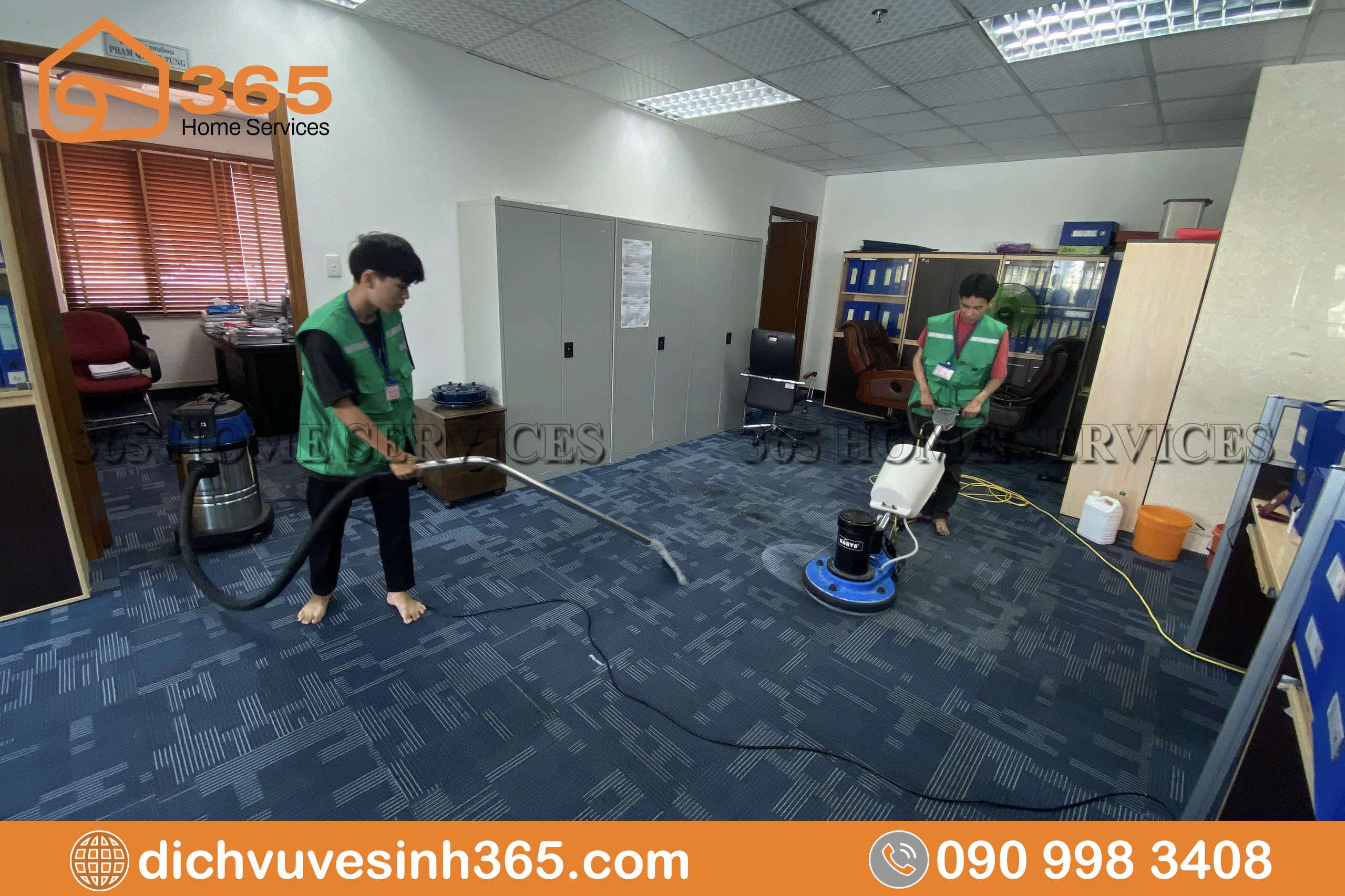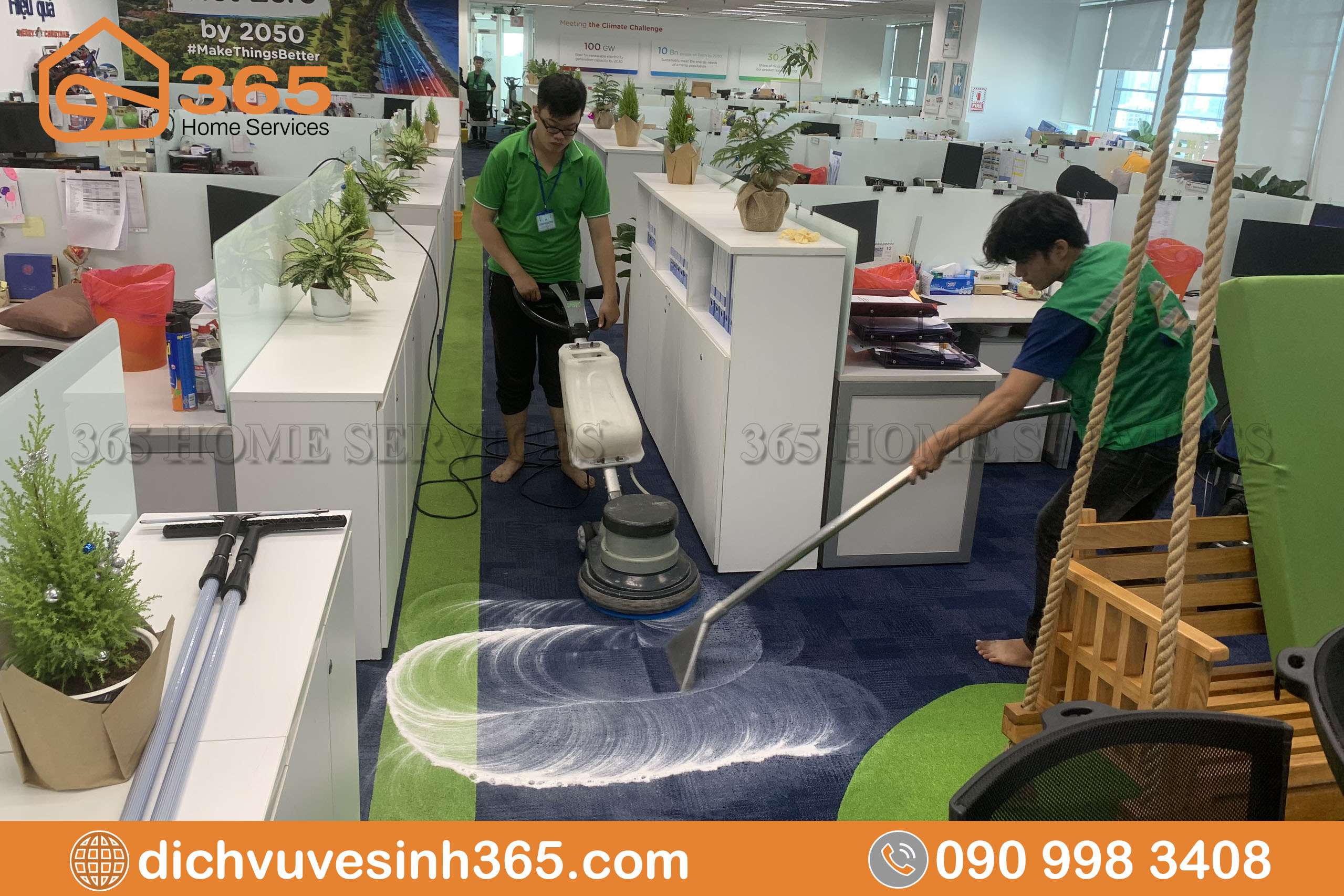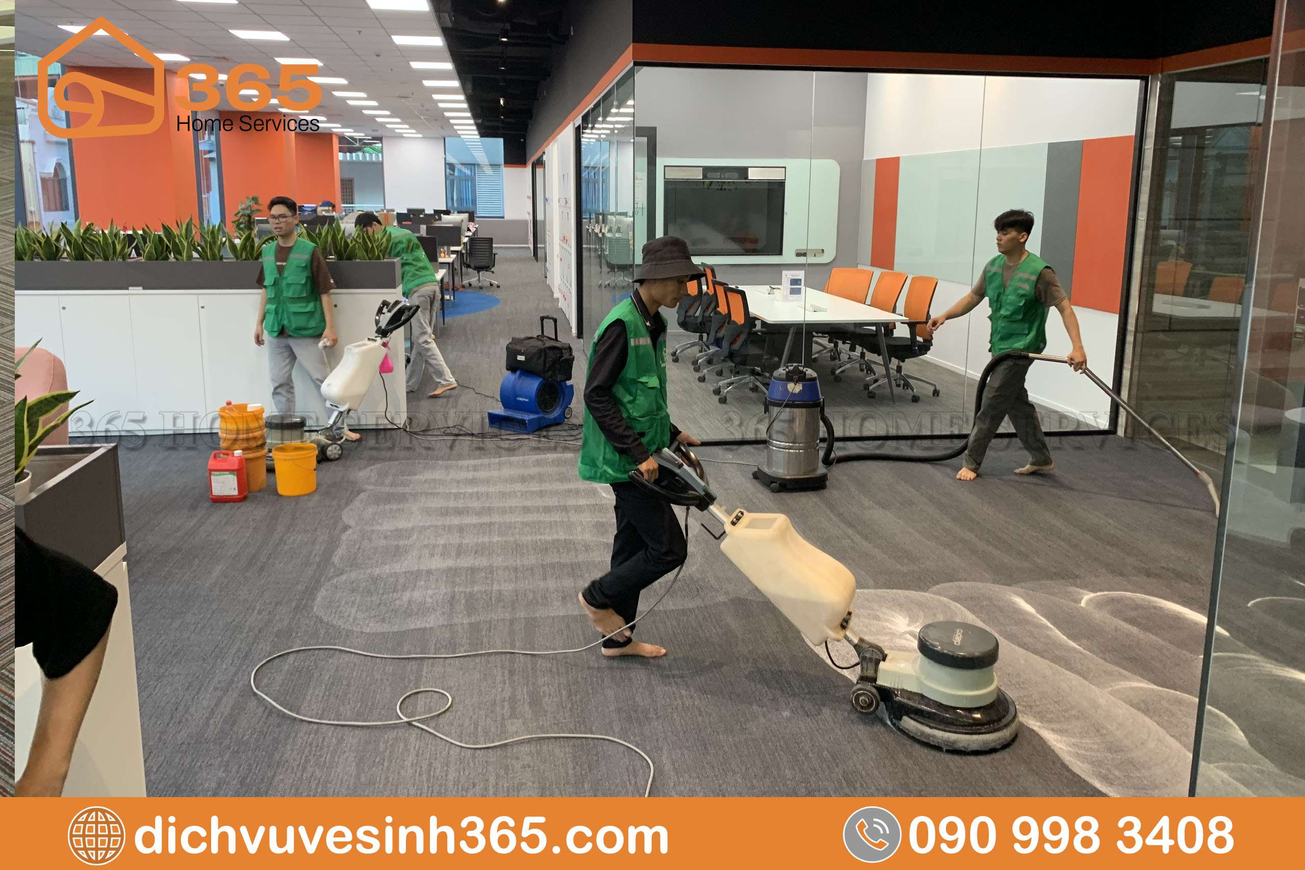 👉 Vệ Sinh 365 làm việc ngoài giờ hành chính hoặc cuối tuần để không ảnh hưởng đến hoạt động văn phòng. Quy trình nhanh gọn giúp thảm khô nhanh để dùng lại.